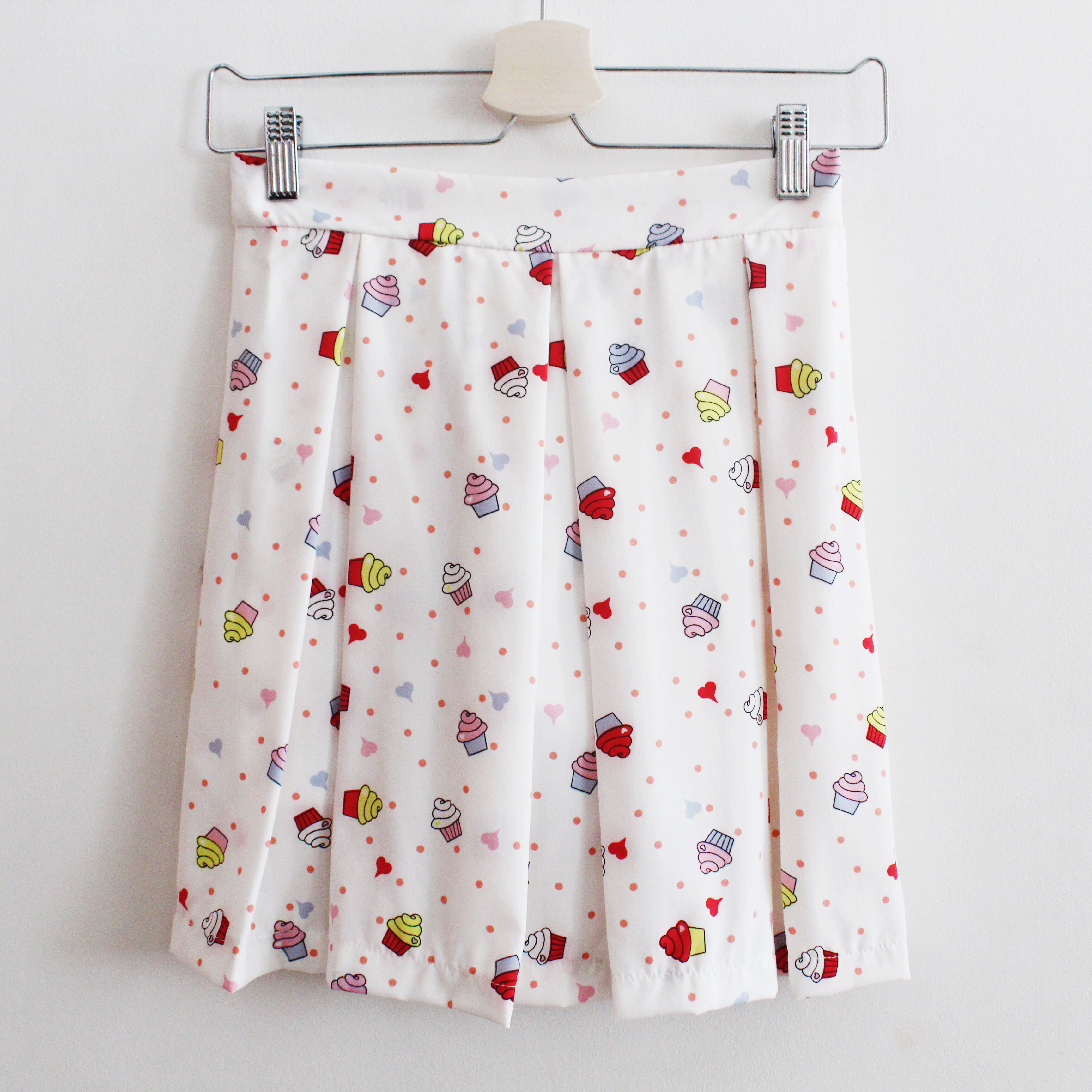 Cream coloured skirts sprinkled with cupcakes all over. Elastic waist at back, safety shorts underneath.