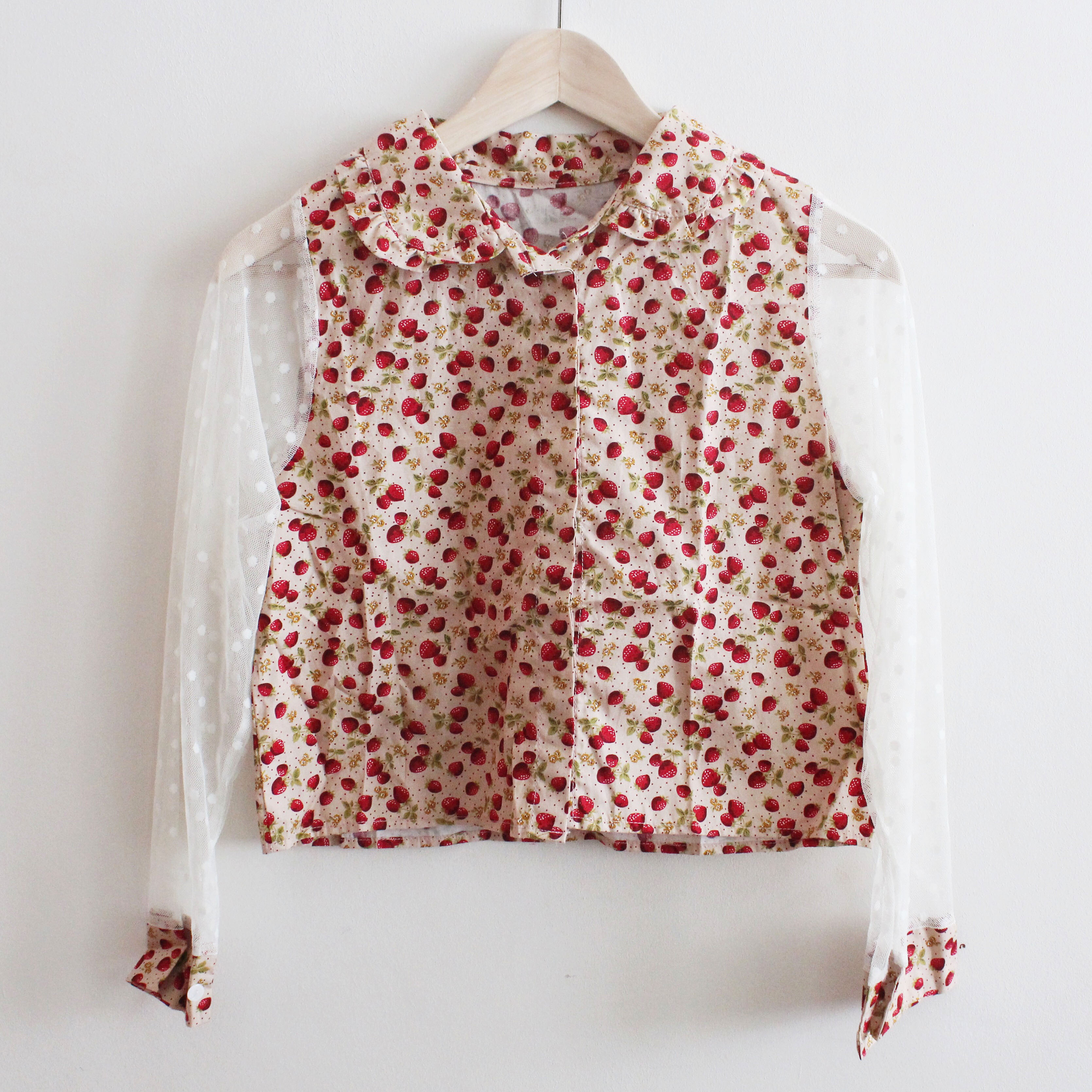 Strawberry printed crop top with super soft mesh sleeves and polka dots.