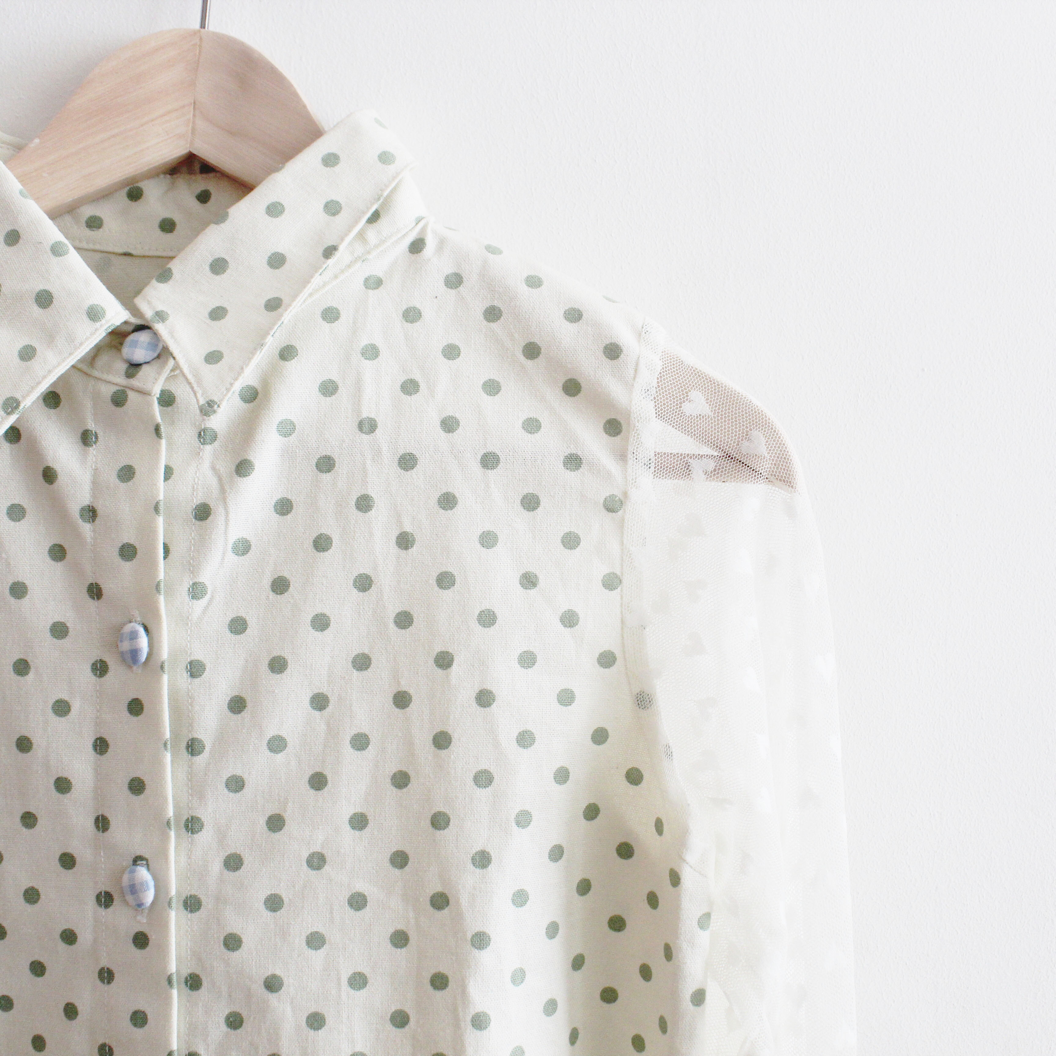 Cream coloured polka dot crop top with super soft mesh sleeves with hearts on them. Ptp- 16" across Length down from Shoulder- 17"