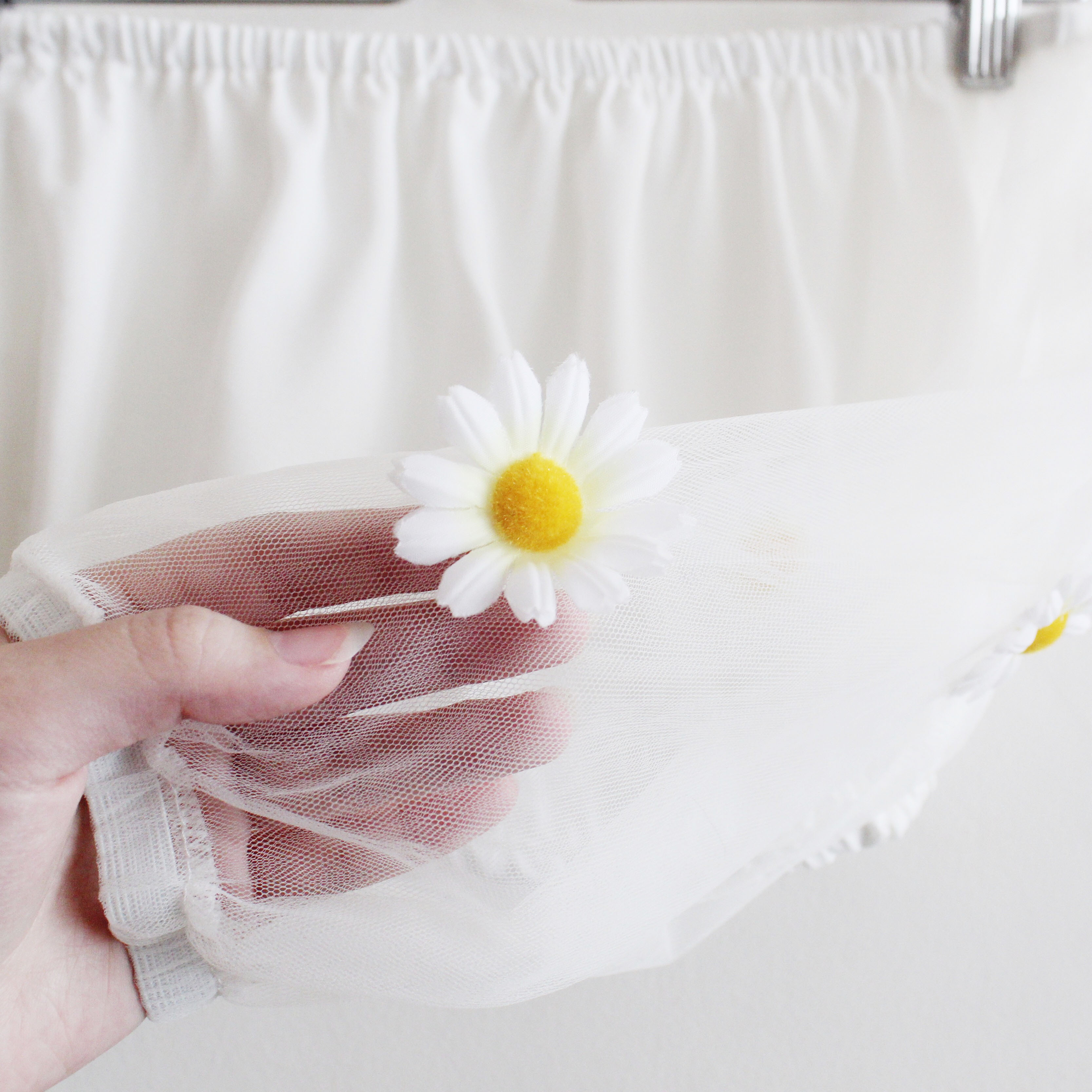 Off Shoulder crop top with tulle sleeves and daisies attached all over them. Top is slightly sheer.