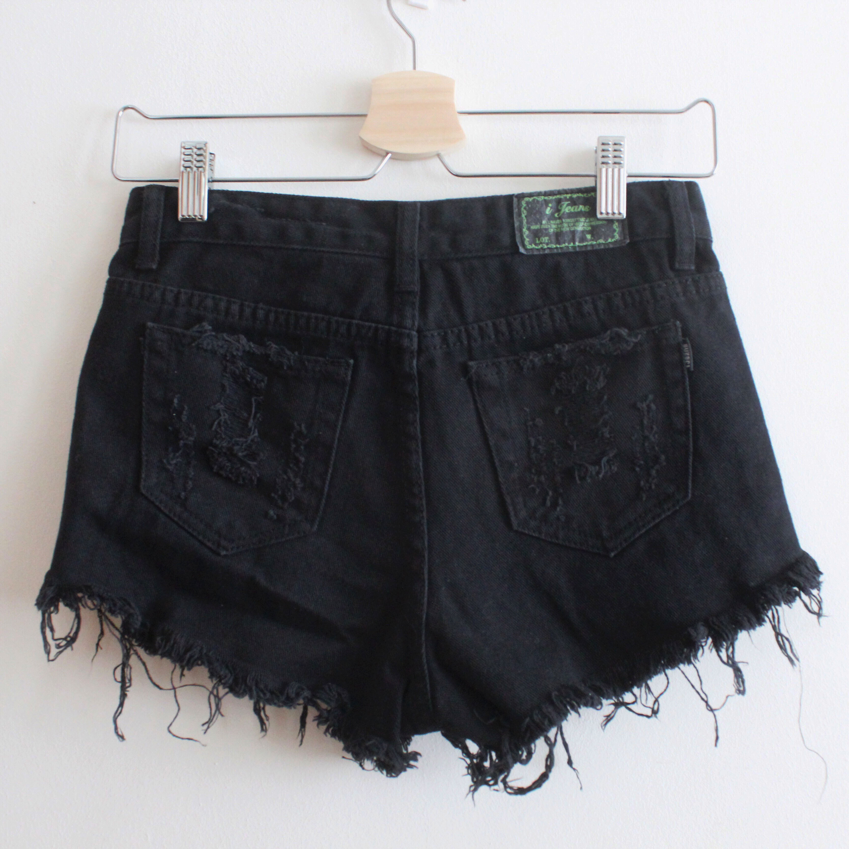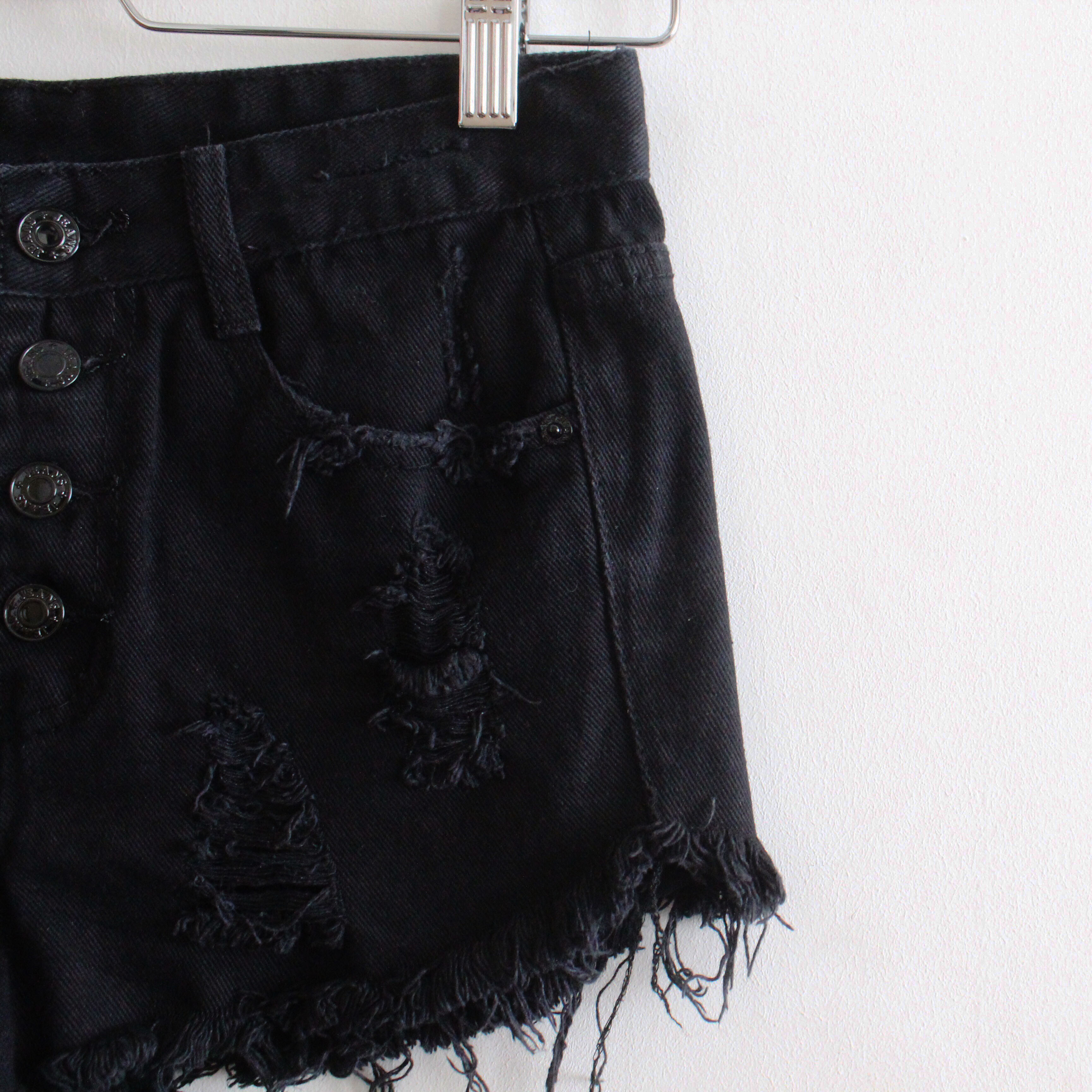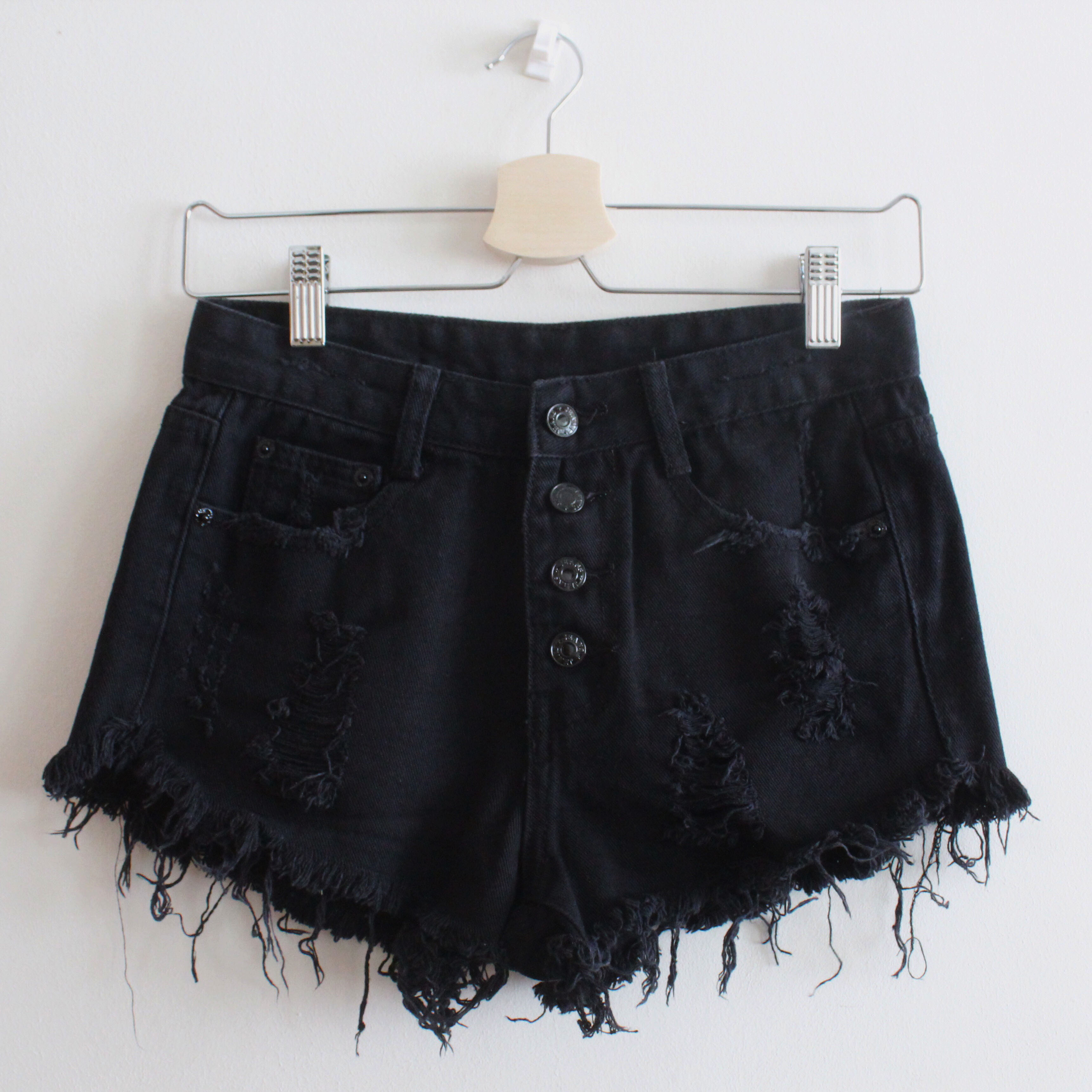 Black High Waist shorts ripped to perfection. An essential in everyone's closet. Waist- 27" Rise- 9.5" Thigh Opening- 10" across